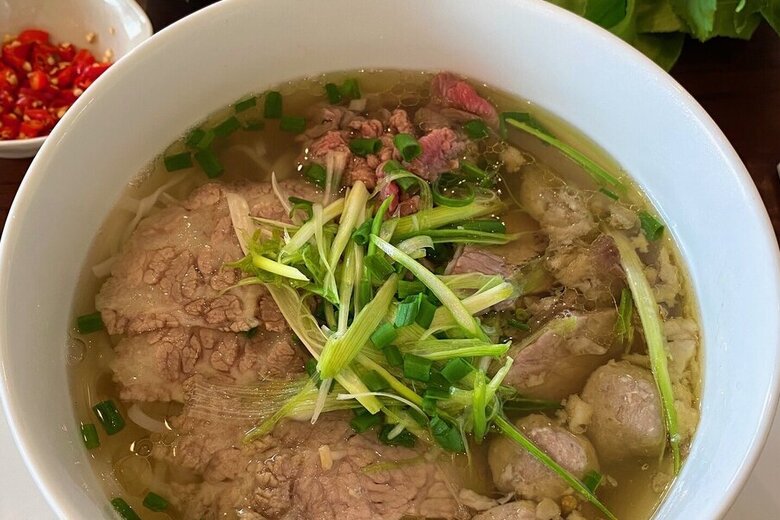 - Bánh canh luộc sơ qua nước sôi, rửa lại với nước lạnh, rồi thả vào nồi nước lèo để 1 lúc cho cọng bánh canh thấm gia vị. Cho hành ngò, rắc tiêu vào.