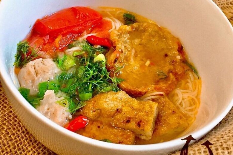 - Cho bún vào tô, thác lác, mực và hẹ sẻ thái nhỏ cùng nước lèo. Khi ăn chan thêm nước chấm vào cho vừa vị mình. Mực và thác lác chấm cùng nước chấm.