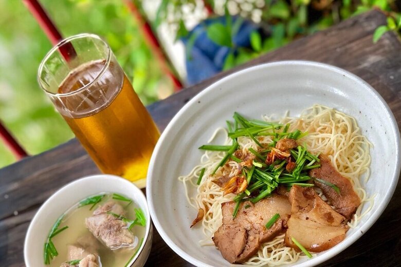- Cho bún vào tô, cho tôm và mực lên rồi múc nước lèo kèm với hành ngò.
